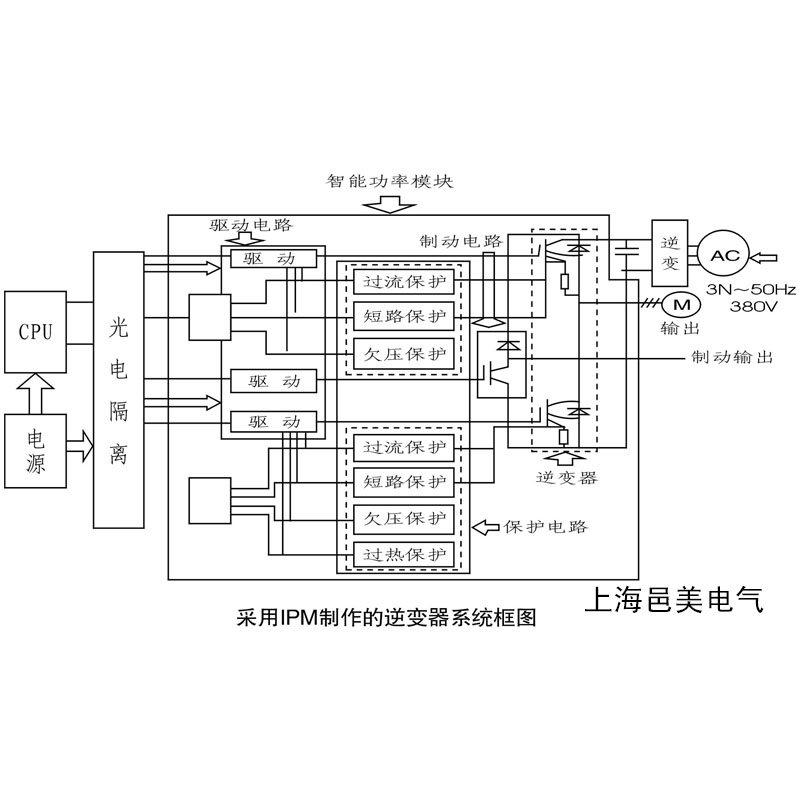 IPM中的每个功率元件都设置有各自独立的驱动电路和多种保护电路,能够实现过电流、短路电流、控制电压降低及过热保护等功能。一旦发生负载事故或使用不当异常等情况,模块内部即以快的速度进行保护,同时将保护信号送给外部CPU进行第二次保护,这种多重保护措施,保证IPM自身不受损坏,与IGBT模块相比,可靠性显著提高。而且IPM的开关损耗、转换效率都优于IGBT,以下分别为采用IPM制作的变频器系统框图和两种模块开关损耗的比较图。